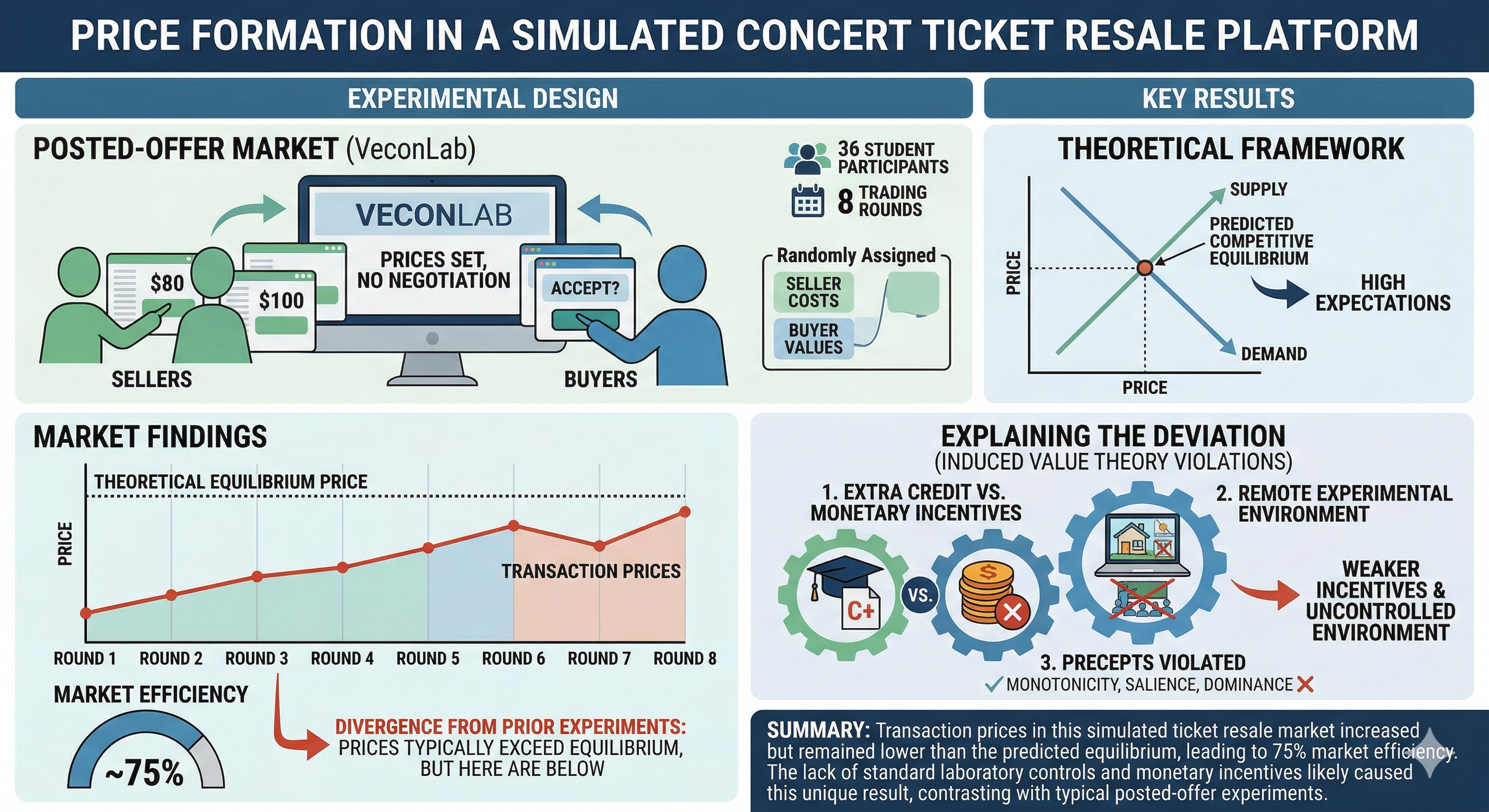 This paper examines price formation in a posted-offer market designed to simulate concert ticket resale platforms, where sellers set prices and buyers decide whether to accept them without negotiation. The experiment was conducted using VeconLab with 36 student participants across eight trading rounds. Randomly assigned buyer values and seller costs allowed for the construction of theoretical supply and demand curves and a predicted competitive equilibrium.